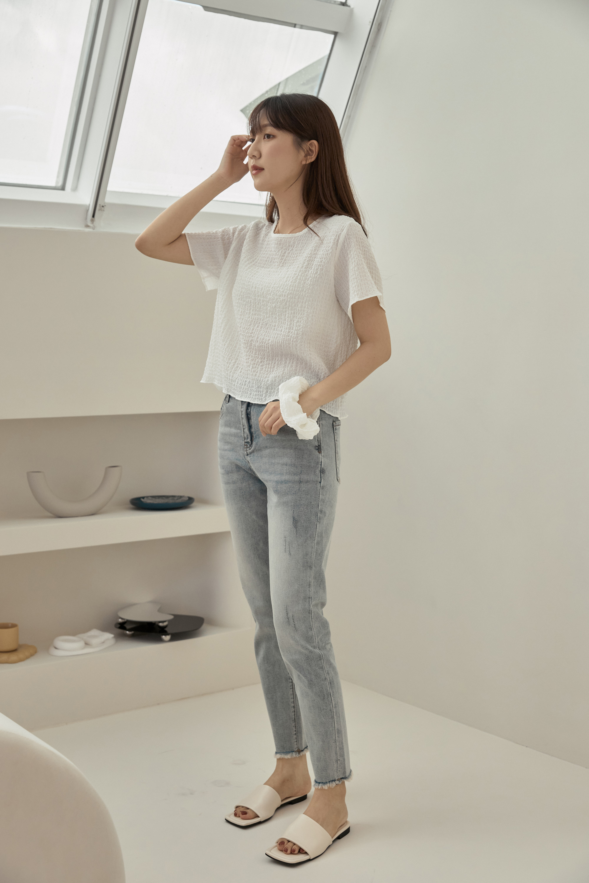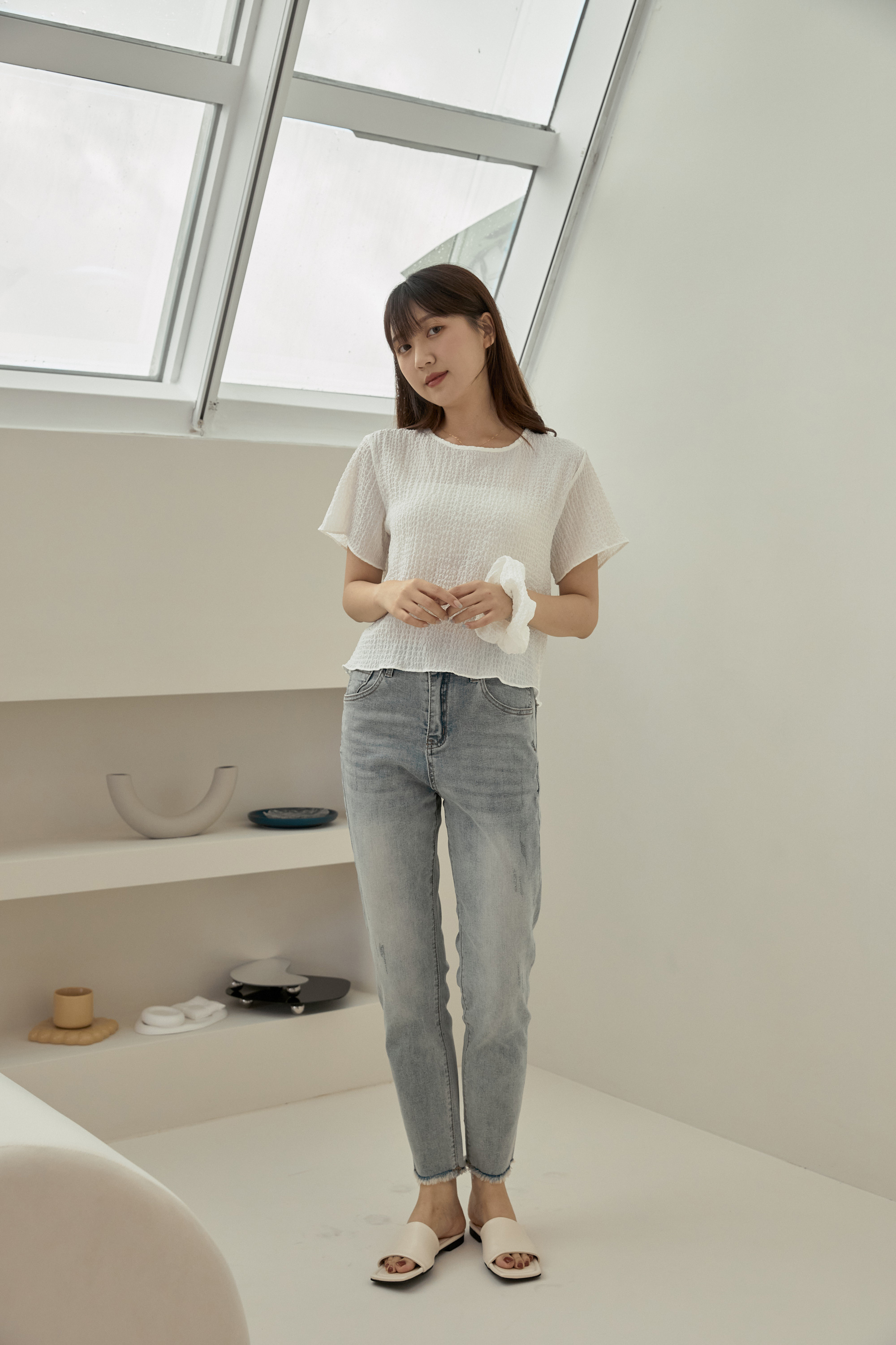 淺色調春夏清新百搭,細緻微刷破點綴的小設計,加上高彈力布料,讓人愛不釋手,夏天也穿得住!